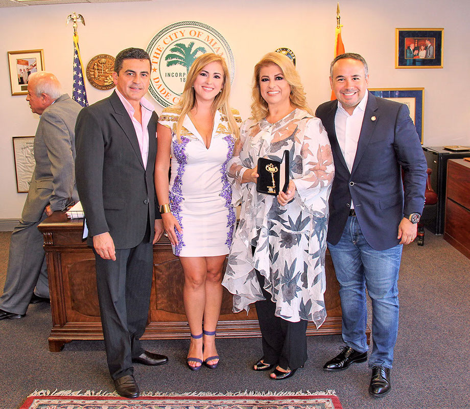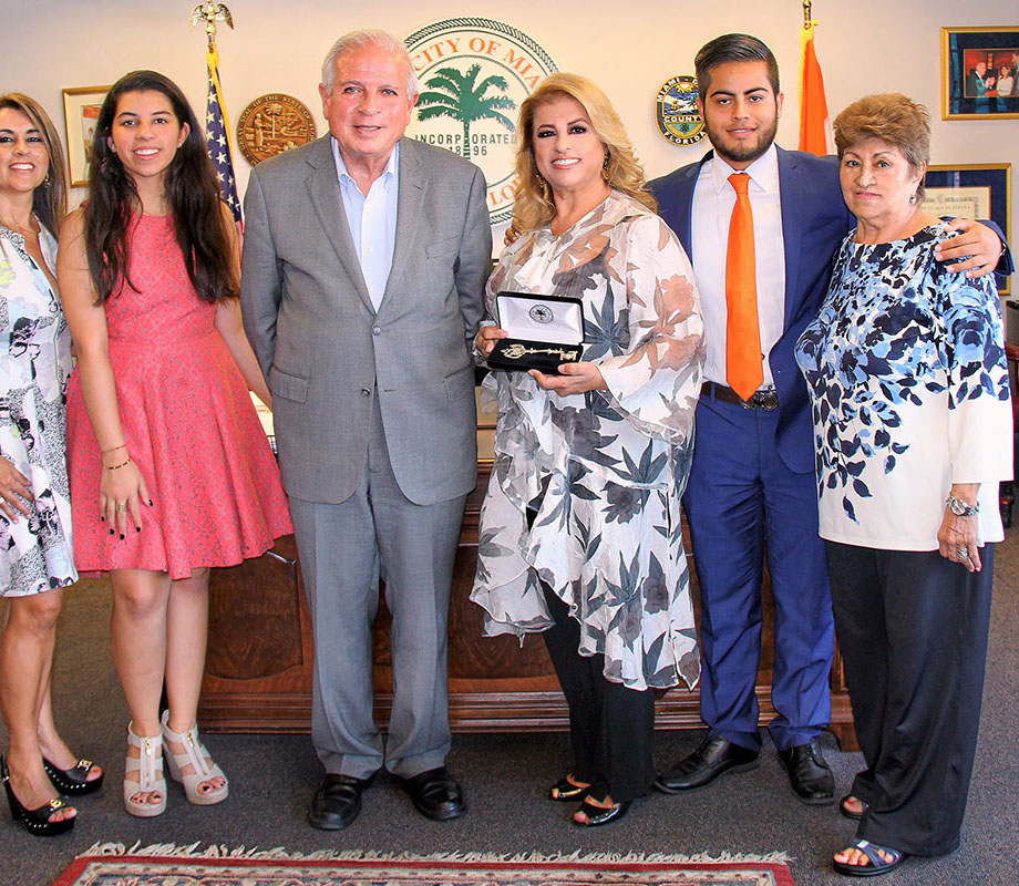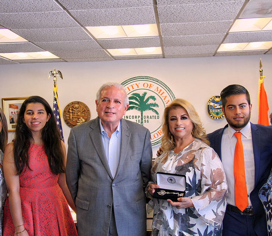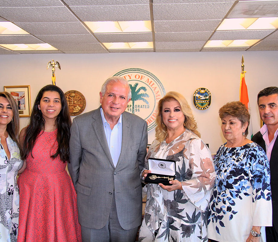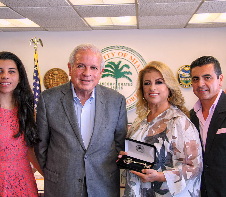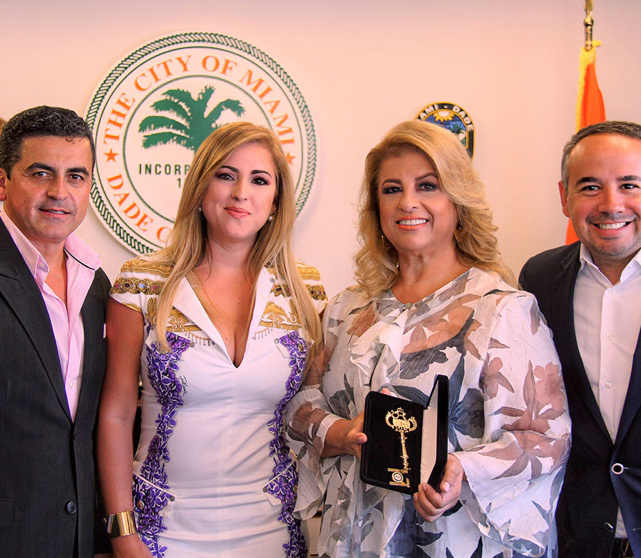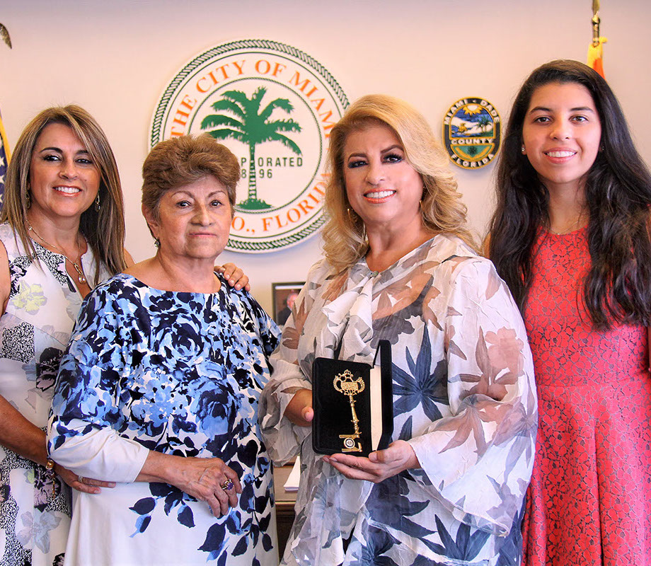 En una ceremonia privada en las oficinas del alcalde de la ciudad de Miami, Tomas Regalado. Se le entregaron las llaves de la ciudad a Gloria Hincapie, en compañia de sus familiares y amigos, por los 30 años de vida profesional y su aporte a la sociedad de Miami